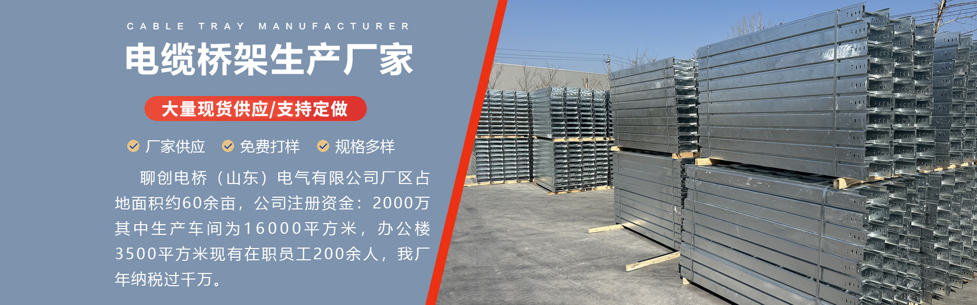 公司簡介 聊創(chuàng)電橋(山東)電氣有限公司是一家專注于電纜橋架研發(fā)、生產、銷售和服務的企業(yè)。公司坐落于山東省聊城市東昌府區(qū)鳳凰工業(yè)園緯四路 16 號,地理位置優(yōu)越,交通便利,廠區(qū)占地面積約60 余畝,其中生產車間為 16000平方米,辦公樓3500平方米,現有在職員工 200 余人,我廠年納稅過千萬。 公司主營產品: 電纜橋架:槽式、梯式、托盤式、網格式等全系列電纜橋架產品,滿足不同場景需求。 母線槽:空氣型、密集型、耐火型等母線槽產品,為電力傳輸提供高效解決方案。 線槽支架:自主研發(fā)的線槽支架系統,有效提升電纜橋架和母…